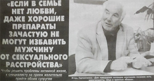 СЕКСОПАТОЛОГ ИГОРЬ ГОРПИНЧЕНКО: «ЕСЛИ В СЕМЬЕ НЕТ ЛЮБВИ, ДАЖЕ ХОРОШИЕ ПРЕПАРАТЫ ЗАЧАСТУЮ НЕ МОГУТ ИЗБАВИТЬ МУЖЧИНУ ОТ СЕКСУАЛЬНОГО РАССТРОЙСТВА»
